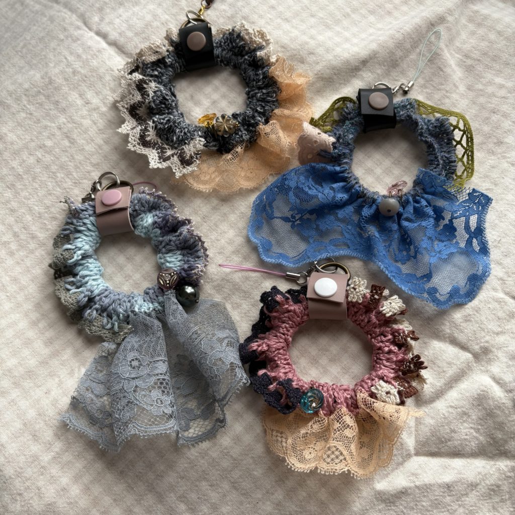しゃうひんしょうかいぶら下げられるようストラップをつけたシュシュ。