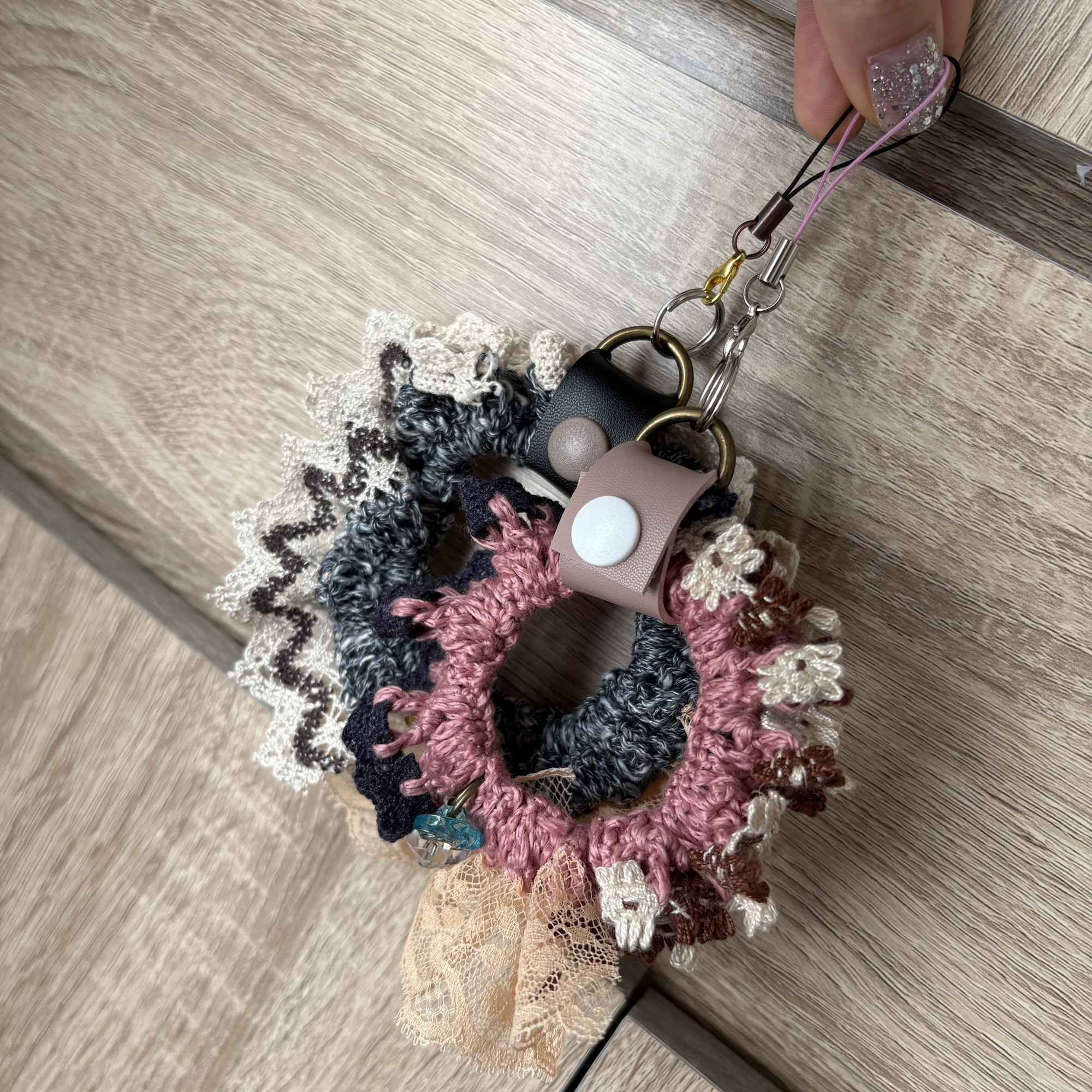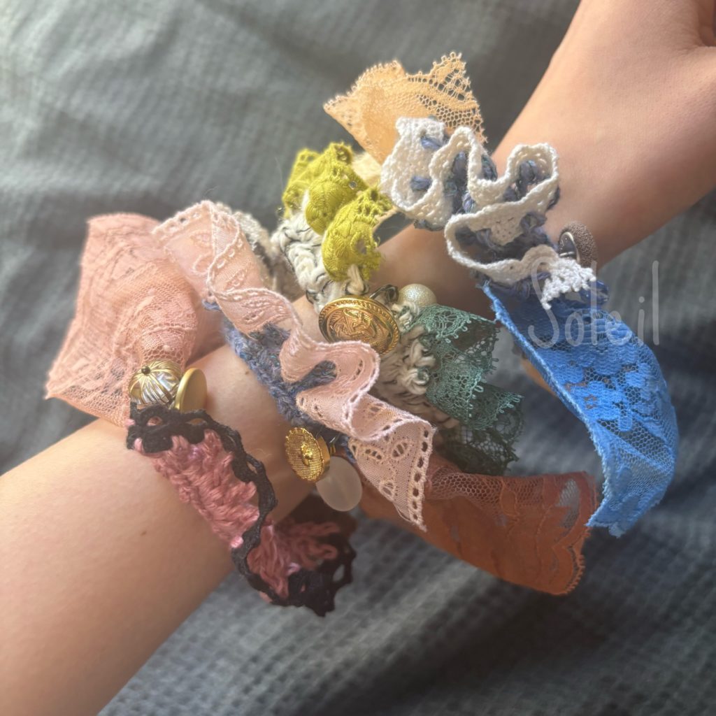 アンティークレースや手染めのレースとボタンを編み込み、上品さとレトロさを兼ね揃えたシュシュを作りました。